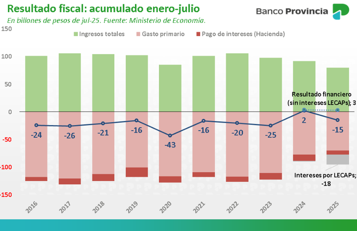 Desde el Provincia mostraron que, entre enero y julio, se pagaron casi $18 billones por los intereses de estas letras, por lo cual, sumando este número, el resultado fiscal acumulado en 2025 pasa de +$3 billones a -$15 billones, cifra similar a la de 2021(-$16 billones).