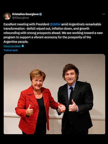 “Fue una excelente reunión en el marco de un tremendo progreso que ha hecho la Argentina, con la inflación en baja, la estabilización de su economía, que ha comenzado a crecer”, dijo Georgieva tras el encuentro. Y completó: “Vamos a trabajar en un nuevo programa, y creo que el resultado será una Argentina más dinámica y próspera”. Tras ello recordó que, tal como marcan las normas del organismo, la última palabra de la negociación la tiene el board. Allí, se espera, pesará a favor de la posición argentina el vínculo personal y político forjado entre Milei y Trump.